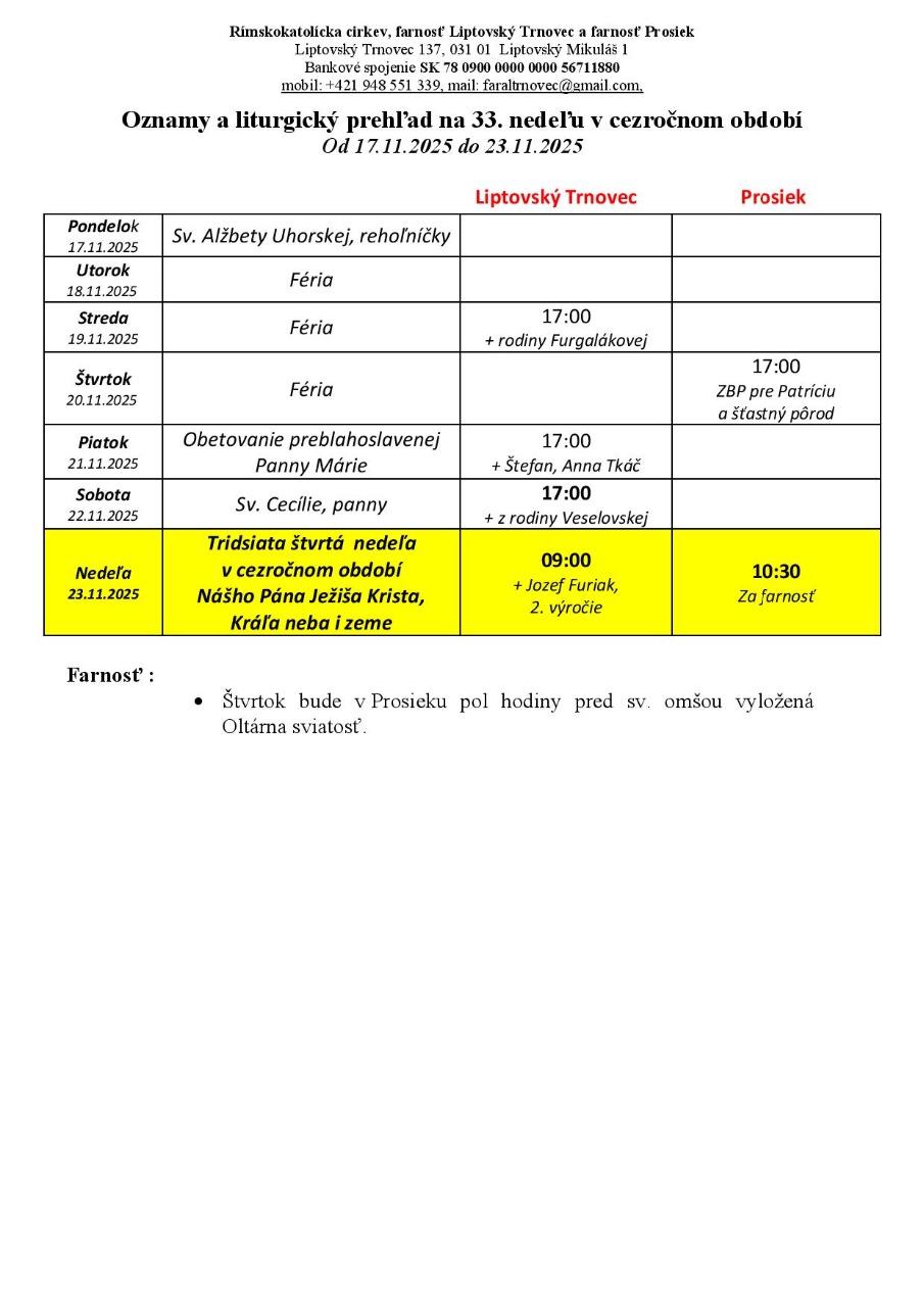 Rozpisy čítaní, upratovania kostola a ružencového spoločenstva v Liptovskom Trnovci.