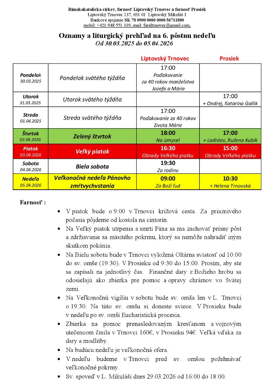 Rozpisy čítaní, upratovania kostola a ružencového spoločenstva v Liptovskom Trnovci.
